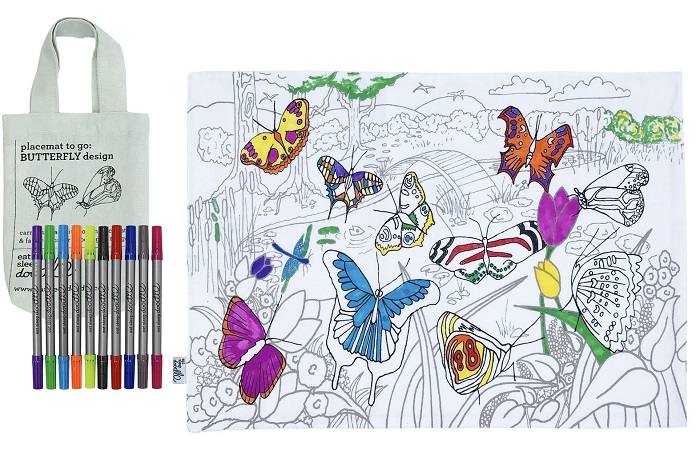 Fun, educational gift where you can colour in the world's most beautiful butterflies The butterfly placemat comes with a set of ten wash-out fabric pens in a mini cotton tote bag Colour in with the pens provided, wash & it's ready for the next work of art It can be used & re-used again and again